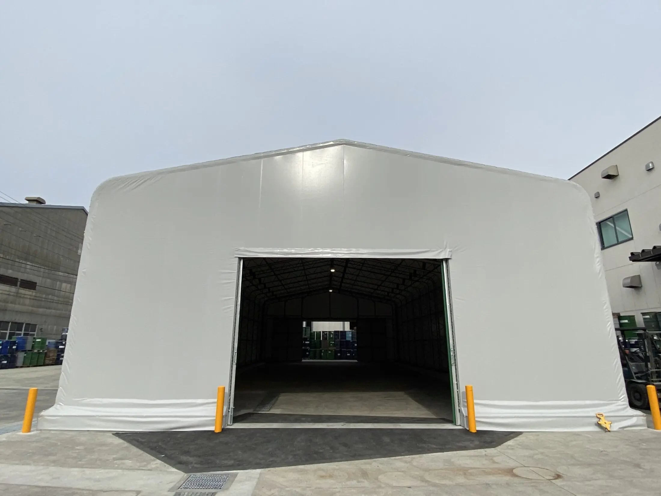 不燃物の保管用途でテント倉庫を採用。周辺建屋との調和を意識し、グレーの膜材を使用しています。