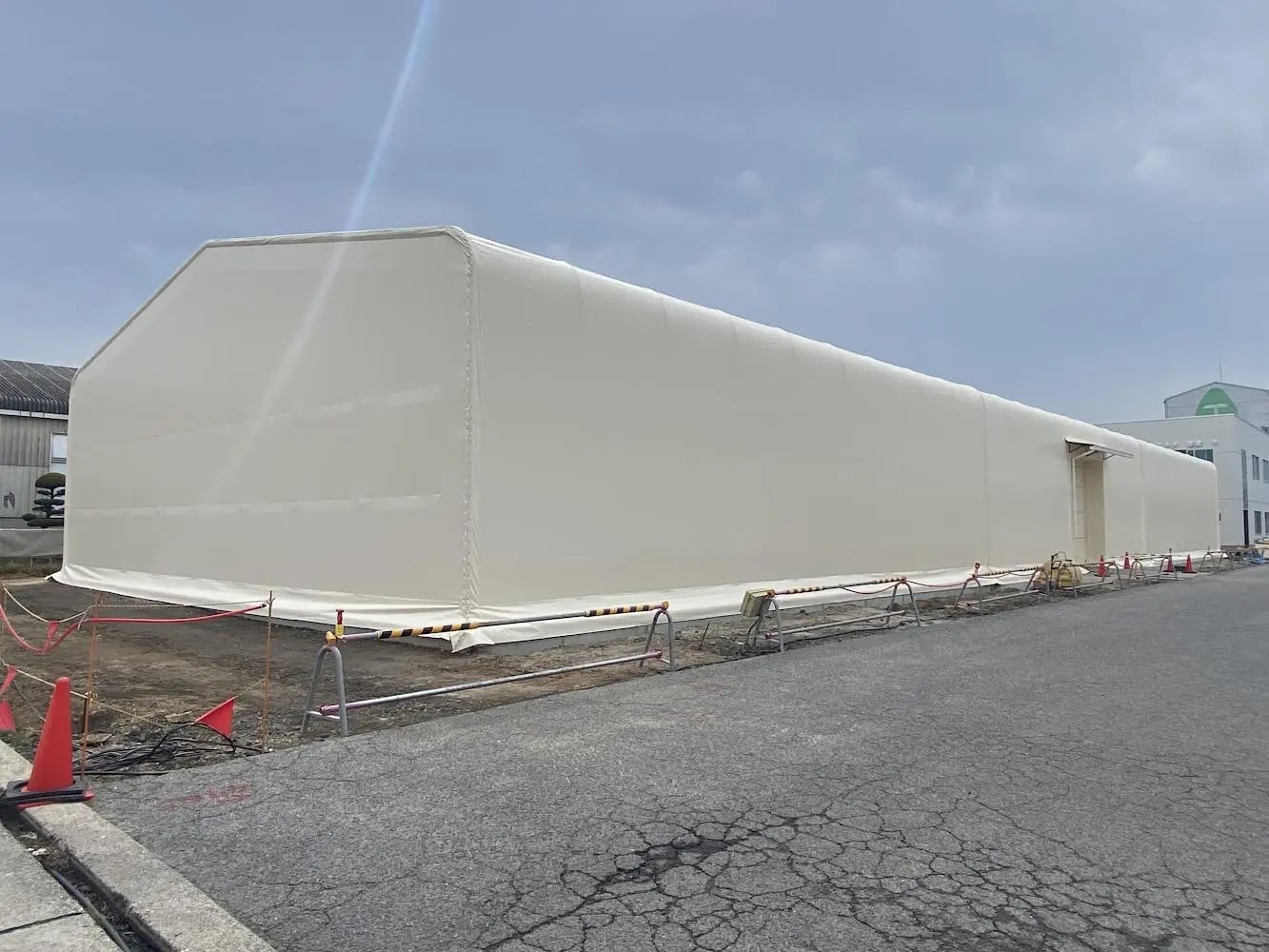 約1,000㎡規模の大型テント倉庫を新設。大量の材料保管ニーズに対応し、500㎡超のため自動火災報知機も設置しています。